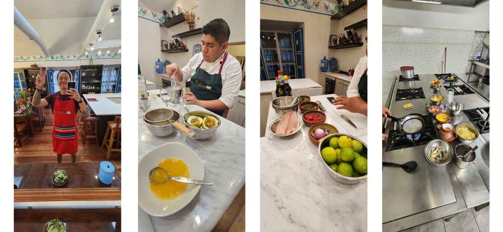 I signed up for an evening class through Cusco Culinary and the experience left me more than just satiated, I was blown away by the professionalism and plethora of food information. Who knew pisco sours (synonymous with Peru) had its start out in life as a whiskey sour? Not I! Through Chef Jesus’s course, I learned how to make said pisco sours, three different types of ceviche, native potatoes and moraya cake, mushroom quinotto (quinoa + risotto), and assorted Peruvian fruits topped with chirimoya cream.